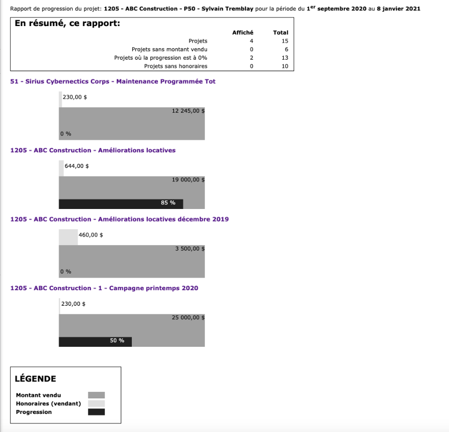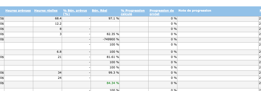 This report is advanced and detailed (financial info, time, %, etc). This one is the best! But, to use it, it is absolutely necessary to produce the service offers and invoices through the Collabox.