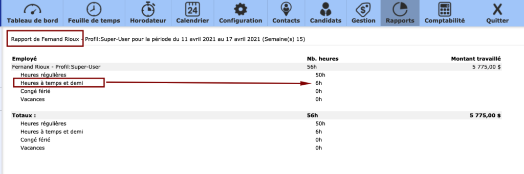 The report result is displayed by employee name. Regular hours are listed, followed by time-and-a-half, vacations and vacations. Other variables are possible depending on your configurations. This way, sick leave or hours on the road could be visible.