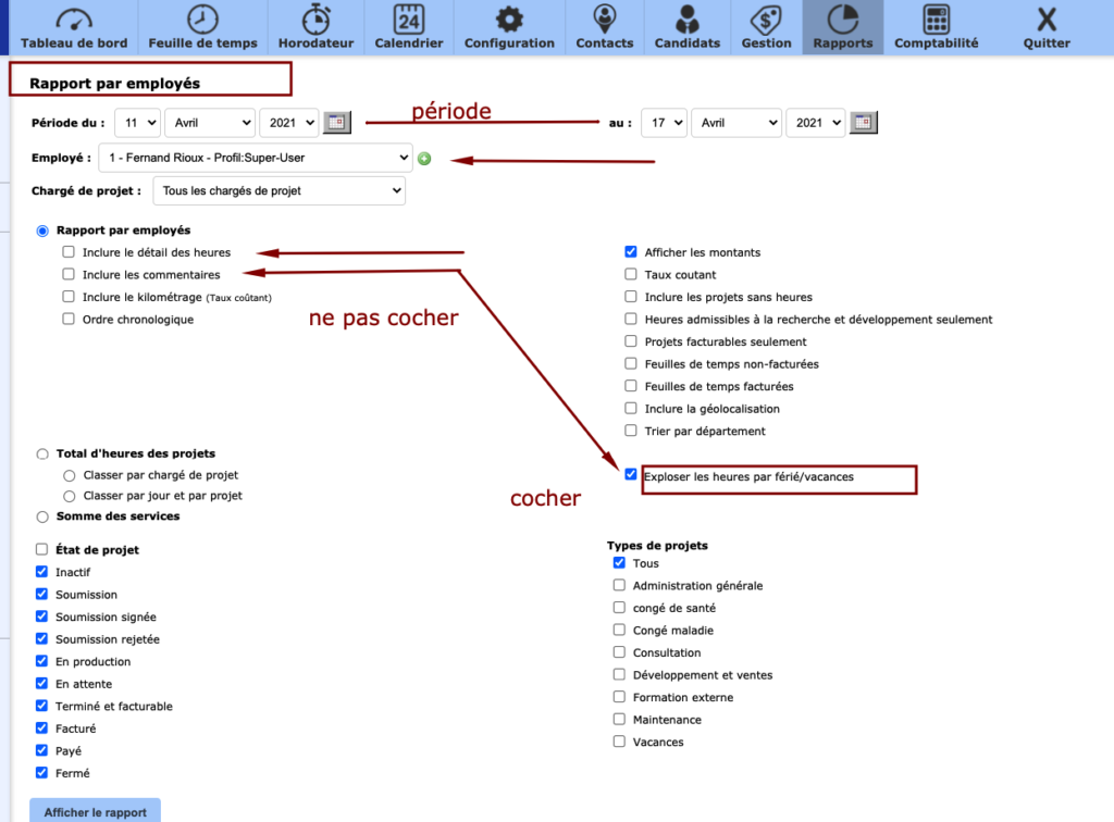 Now that the report options by employee are displayed, choose a time period and an employee’s name. You can also choose not to select any employee to get a detailed report for each person working in your company.