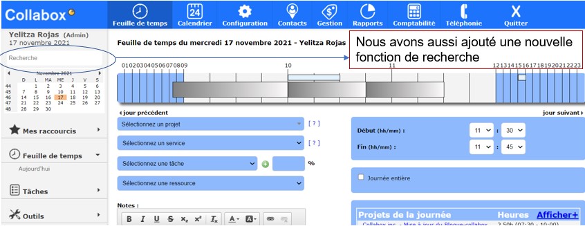 You can therefore enter keywords in the bar above the calendar to start the search. Collabox will then present to you the result of its search, classified by category. These separate your results according to the different Collabox modules such as timesheet, contacts, service offer, etc.