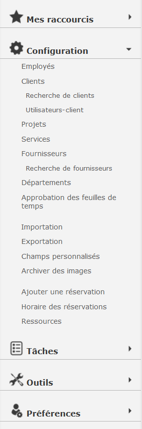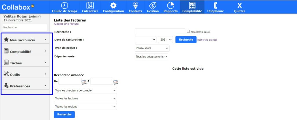 Moreover, when you select a tab in the main menu, i.e. a module in Collabox language, the navigation bar of this module is automatically displayed on the left. For example, when opening the “Configuration” menu, all the features attached to it are displayed.