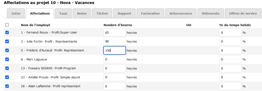 For even more efficient management, add your employees’ accumulated vacation hours in the “Assignment” tab of the project. These hours can be found in the time bank report which you can view here.