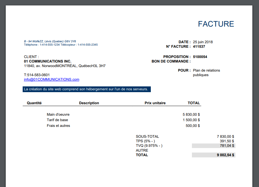 By filling in these fields, the formatting of the invoice is automated. When you add an invoice for this product, you will get a finished document that looks like this: