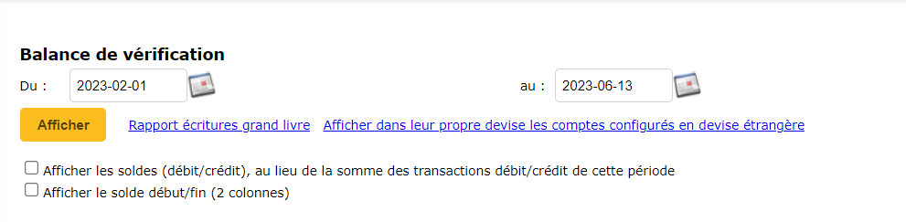 Among the options available to you, indicate the correct time interval, then click on “Display”. If necessary, check the boxes to customize the display of the balances. By default, all trial balance amounts are in Canadian dollars. If you have accounts in foreign currencies and wish to see the amounts shown on the account, click on the “Show accounts set up in foreign currency in their own currency” link.