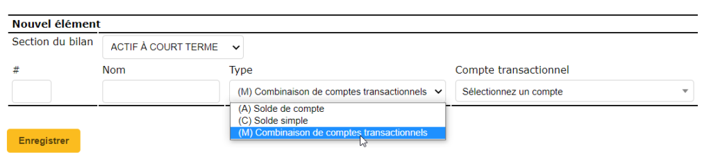 Add a new item to the balance sheet by giving it a balance sheet section, a number and a name. Then, select the associated transactional account and choose the desired balance type.